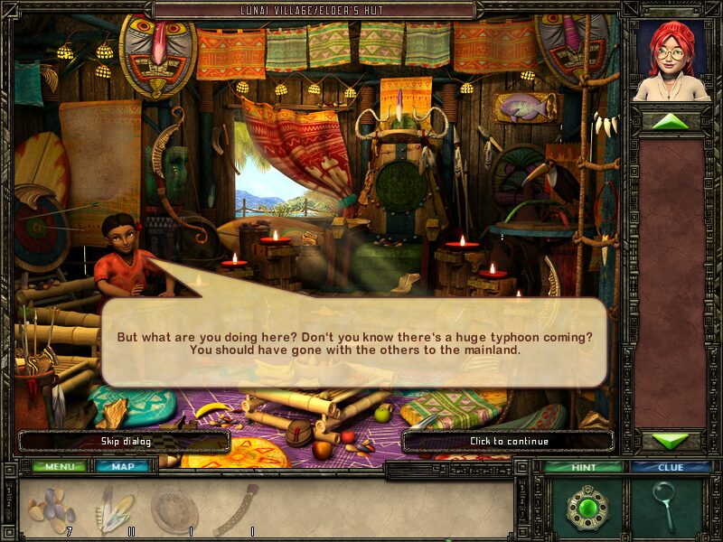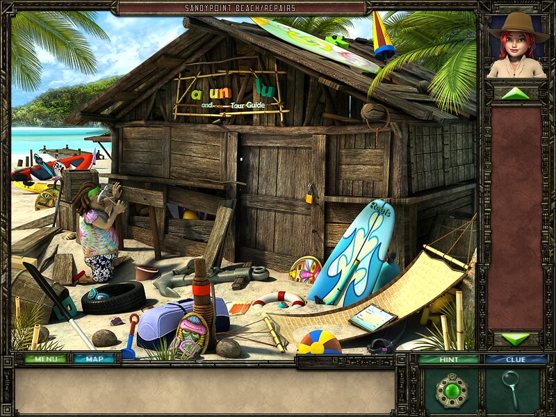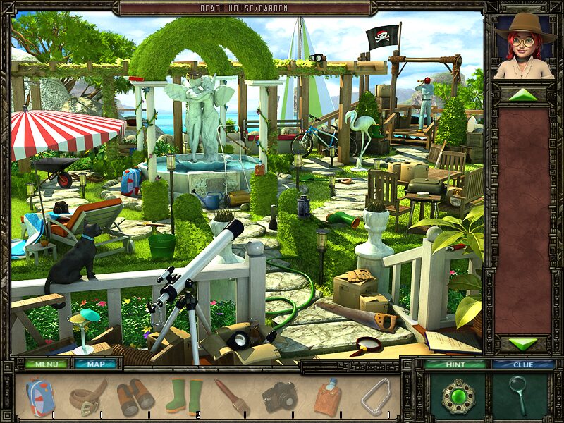 Alexandra Fortune: Mystery of the Lunar Archipelago leans into the classic hidden object genre with an added layer of adventure-driven puzzles. Players navigate through beautifully rendered static scenes, scanning every nook and cranny to collect fragments of items displayed in a tray at the bottom of the screen. Each piece collected narrows down the count shown beside its thumbnail, offering a clear, intuitive roadmap to completing the required object. Once reconstructed, these items move to the inventory at the right side of the screen, ready to be dragged and dropped where they belong to advance the story.