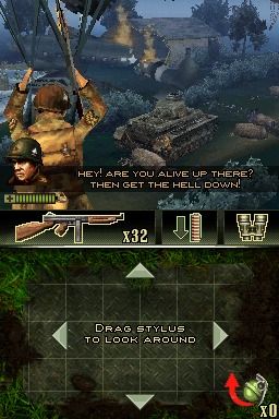 On the Nintendo DS, controls are split between traditional buttons and the touch screen. The D-pad and face buttons handle movement and shooting, while the touch screen lets you direct your squad with simple taps. Calling in a flank, ordering a suppressive barrage, or regrouping behind cover feels intuitive, though managing both screens during intense firefights occasionally leads to fumbling. Still, the control scheme is a solid adaptation of the console Brothers in Arms experience to a handheld format.