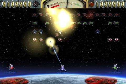 The alien ships and bomb sprites are distinct and easily recognizable, ensuring you never lose sight of the action, even as chaos erupts on-screen. Subtle details, like the shimmering curvature of the Earth and the cratered surface of the invading Moon, add depth without overwhelming the minimalist design. Boss levels introduce creative visual twists: the Pong arena is rendered in crisp retro lines, and the Breakout bricks glow with neon hues, creating a visually varied experience that keeps you engaged.