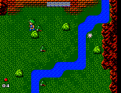 Rendered in crisp 8-bit style, Golvellius uses a vibrant color palette to bring its valley and cave environments to life. Rolling hills and rocky outcroppings are defined by bold lines and contrasting tones, ensuring that every enemy and pickup stands out. The sprites for Kelesis and the demons are small but detailed, with clear animations for attacks and damage states.