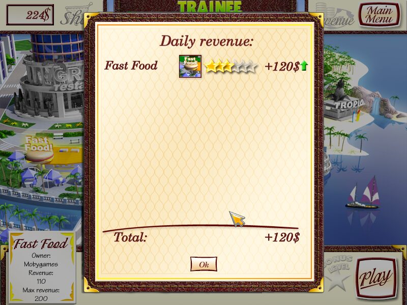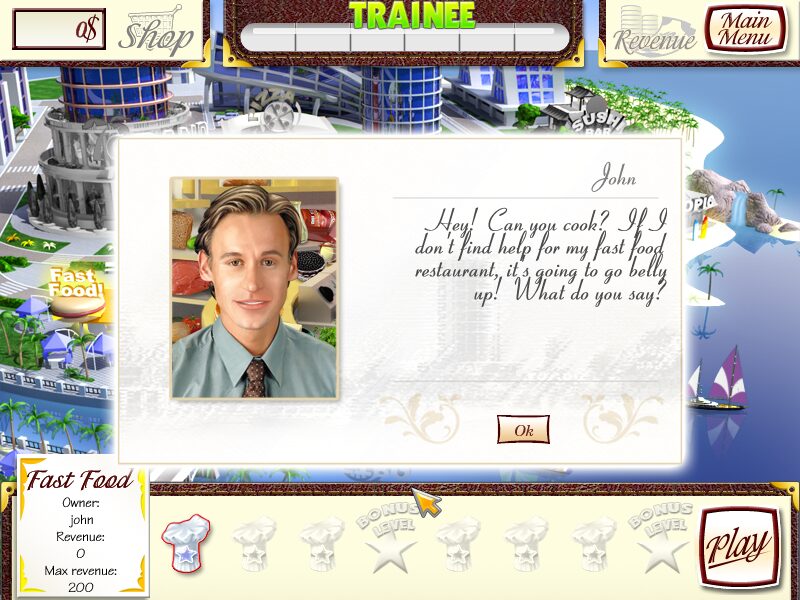 After cooking, you serve the meal and must then quickly collect the cash payment to free up the table for a new customer. Every stage challenges you with both a minimum money goal and an expert threshold, unlocking new equipment, upgrades, and additional restaurant locations as you progress through the game.