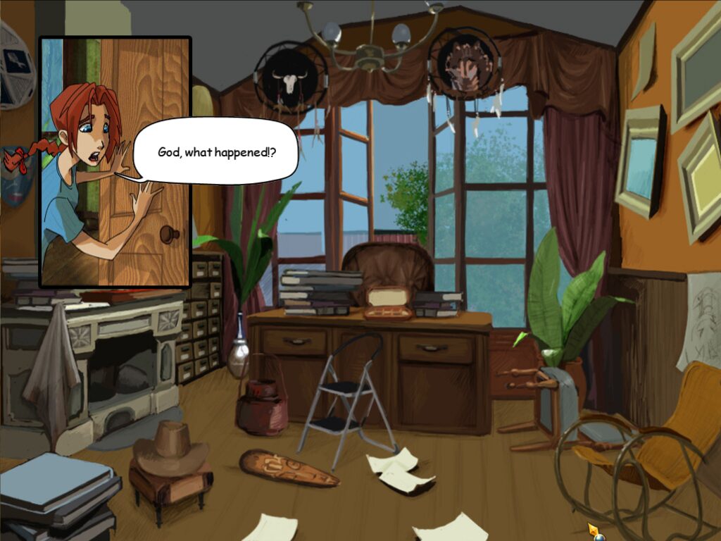 Transitions between areas are accompanied by short visual flourishes—such as a tearing scroll or a dusty door creaking open—that add polish without interrupting the flow. Character portraits during dialogue are expressive and detailed, conveying emotion as Natalie uncovers clues or reacts to new revelations from her missing grandfather’s journals.