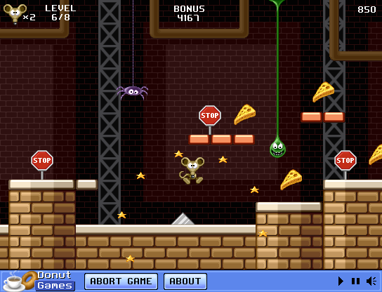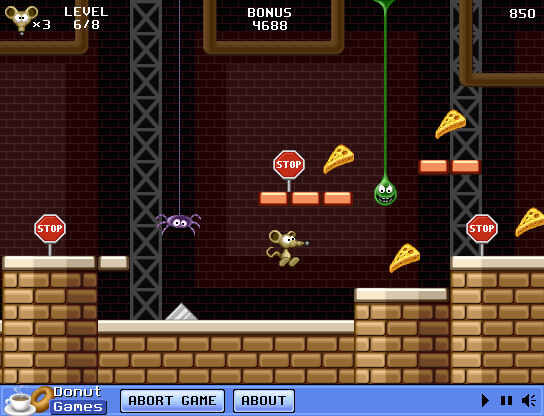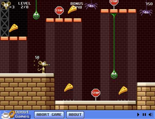 Each of the eight levels is designed around collecting every last crumb of cheese. As you advance, new enemy types appear—spiders that scuttle along the ground, slimy blobs that stick you in place, and razor-sharp blades that slide back and forth. You have three lives per run, and dying sends you back to the last stop sign, adding a light penalty without killing the fun. The quick restarts ensure you never wait long to jump back in and try again.