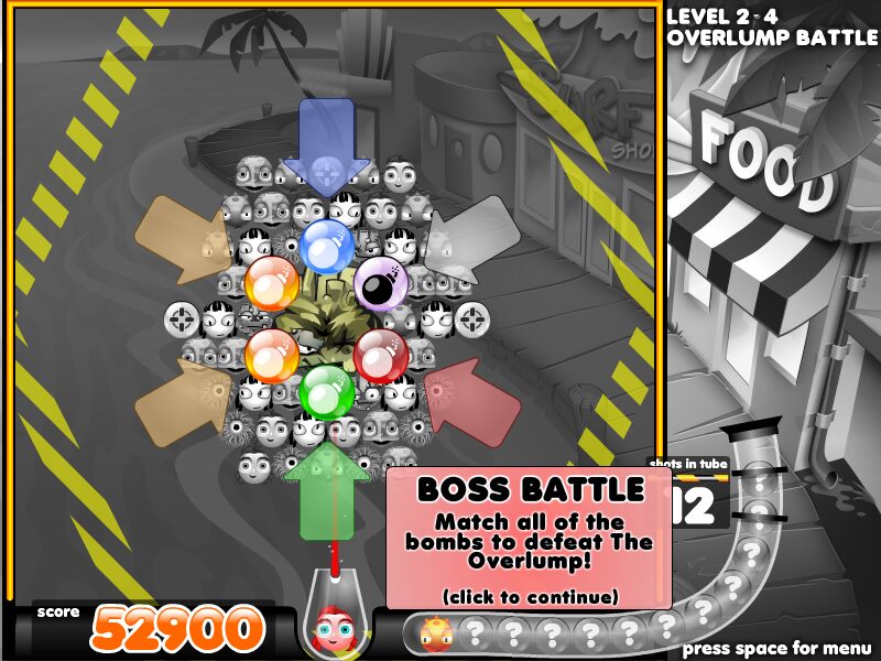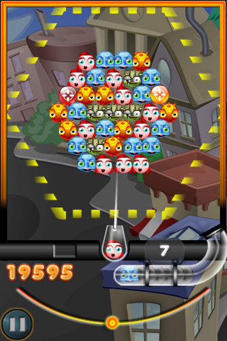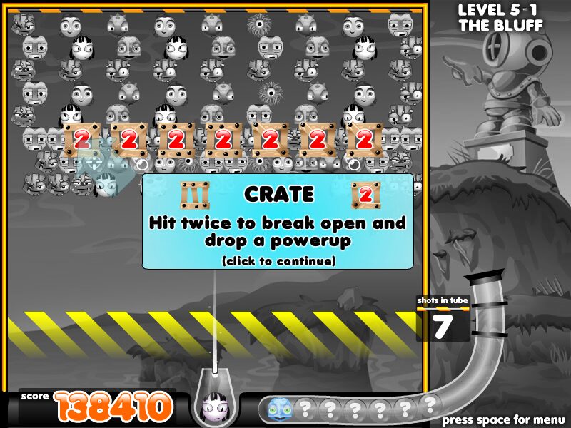 Power-ups appear as specialized balls in the same matching manner as regular heads. Grabbing a sureshot ball grants an aiming reticule to precisely plot your trajectory, whereas a hotfoot ball burns through an entire row upon impact. There’s also the plunger ball for yanking problematic heads right off the screen, bomb balls to clear tight clusters, and bubblebubble balls that swap out colors wholesale. Even crates lurk among the formations, requiring multiple hits to break open and release hidden boosts.