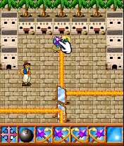 Alibaba and Forty Thieves centers on clever environmental puzzles framed within ten intricately designed mazes. Each map hides four of the titular thieves, but finding them is only half the battle. To advance, players must manipulate terrain elements—rotating mirrors to reflect fire, using bombs to clear rubble, and employing torches to melt ice—while charting a safe path to each outlaw. With unlimited lives and two difficulty settings, the game strikes a satisfying balance between accessibility and challenge, encouraging experimentation without harsh penalties for missteps.