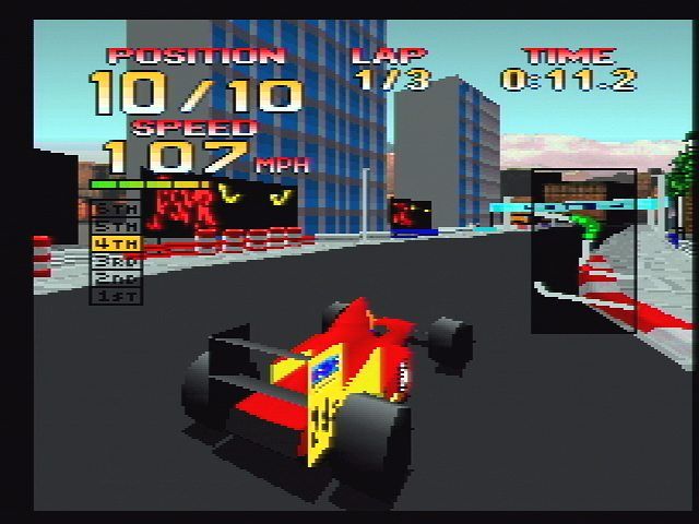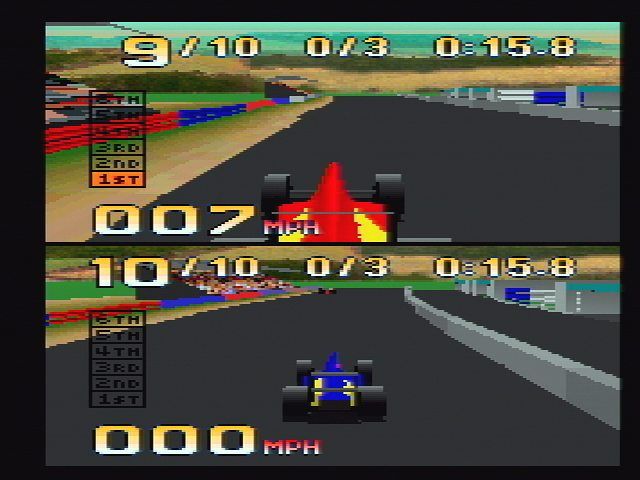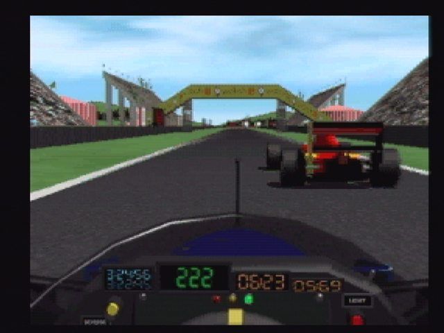 The game’s fully 3D environments are constructed from texture-mapped polygons, and they succeed in creating a convincing sense of speed and scale. Tracks are rendered with crisp edges and vibrant colors, and the high-contrast textures make roadside barriers, grandstands, and pit lane buildings immediately recognizable, even when you’re hurtling past at top velocity.