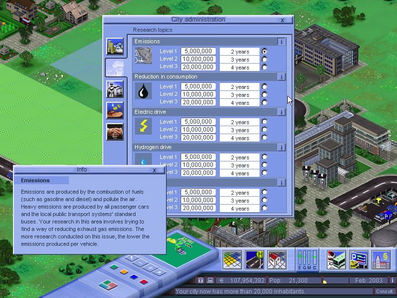 On top of day-to-day planning, Mobility introduces a research system that drives long-term improvement. You can invest in emission reduction technologies, fuel-efficient or alternative-fuel vehicles, and even teleworking initiatives to lower peak-hour traffic. Adjusting taxes and fines—rewarding electric car drivers or imposing surcharges on heavy polluters—gives you fine-tuned control over citizen behavior and quality of life.