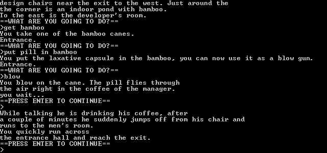The learning curve is approachable, the humor lands consistently, and the scenarios feel fresh even though the basic setting—an office under siege—might sound familiar. The text parser delivers reliable performance, and occasional parser misunderstandings become part of the fun rather than a source of frustration. Hints are judiciously offered, ensuring momentum never flags for long.