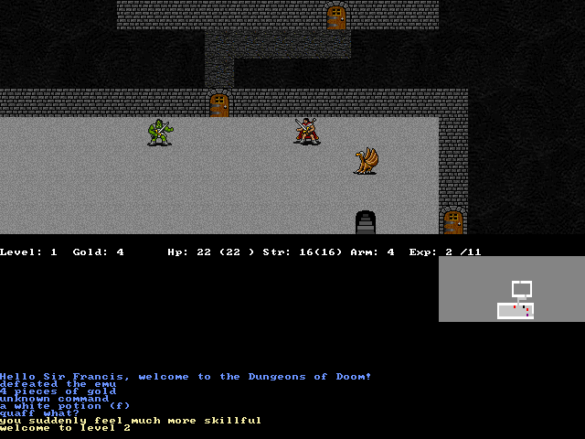 The screen is divided neatly into two halves: the upper section shows your current viewport of the dungeon, complete with subtle lighting effects that mimic torchlight flickers, while the lower half houses a scrolling message log and a mini-map of explored areas. This layout drives efficient decision-making, as you can track your progress and view combat feedback without toggling between screens.