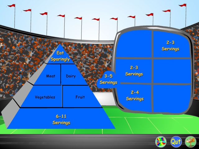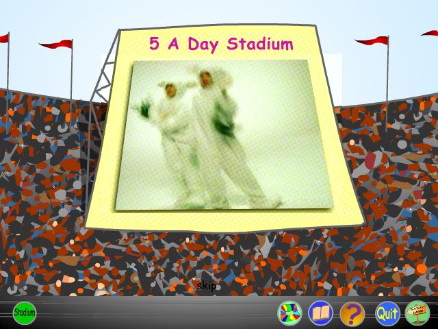 5 A Day Adventures centers on a colorful game board featuring eight distinct activities, each designed to teach children about healthy eating and physical activity. Players navigate this board by selecting segments led by anthropomorphic fruits and vegetables, turning nutritional facts into playful lessons. The intuitive menu allows young users to easily jump into either the Challenge or Ultimate Challenge mode, ensuring accessibility even for the youngest gamers.