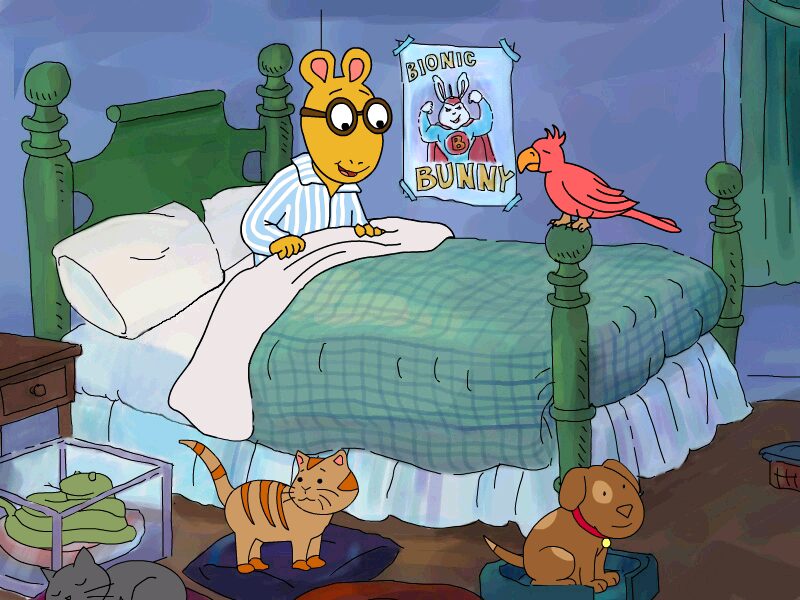 Arthur’s Pet Chase is framed as a dream sequence, launched by Arthur drifting off to sleep after signing in his 30th pet-sitting client. His mother and sister DW voice their doubts, setting the stage for a nighttime adventure where all the animals escape and scurry across the city.