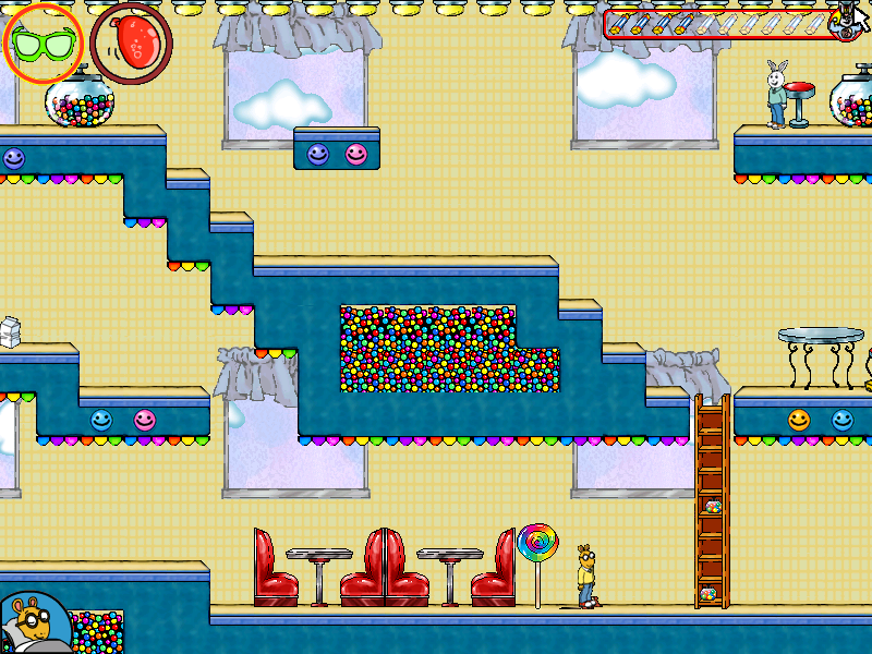 Visually, Arthur’s Pet Chase embraces a vibrant, cartoon-inspired aesthetic that mirrors the PBS television series. Character sprites are bold and expressive, capturing the personalities of Arthur, DW, and the various quirky monsters you’ll encounter—flying books, evil troll dolls, and even malignant hamburgers.
