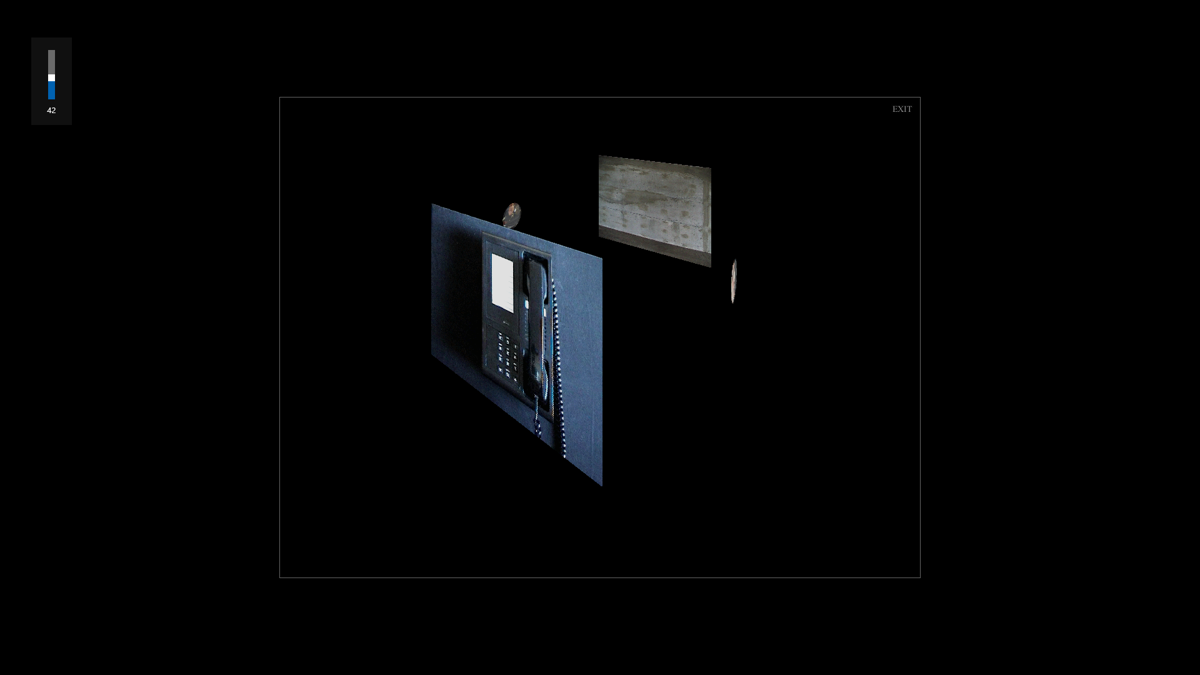 The floating panels appear suspended in a pitch-black void, their borders glowing faintly to guide you through the labyrinth. Basic 3D rendering stitches the environment together, giving a subtle sense of depth without overwhelming the sense of isolation. There are no detailed textures or complex models—everything is purposefully stripped back to keep the focus on the FMV sequences and the puzzles they contain.