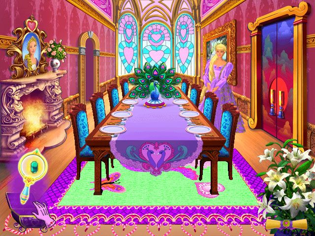 The art style in Barbie as Rapunzel: A Creative Adventure leans heavily into vibrant, pastel-filled environments that appeal to younger audiences. Each castle room feels distinct, decorated with ornate details—flowing draperies, carved archways, and twinkling chandeliers—that transform as you restore them. The color palette remains bright and friendly, ensuring every object is easy to identify.