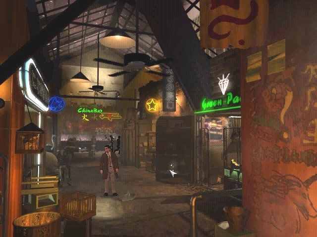 Blade Runner sports some of the most visually striking environments of its era, thanks to meticulously crafted pre-rendered backgrounds. The game’s portrayal of a rain-soaked, neon-lit Los Angeles captures the essence of the film’s dystopian aesthetic. Each city block is dense with atmospheric detail—steam rising from vents, flickering holographic ads, and distant, hazy skyscrapers—all contributing to an immersive sense of place that few contemporaries could rival.