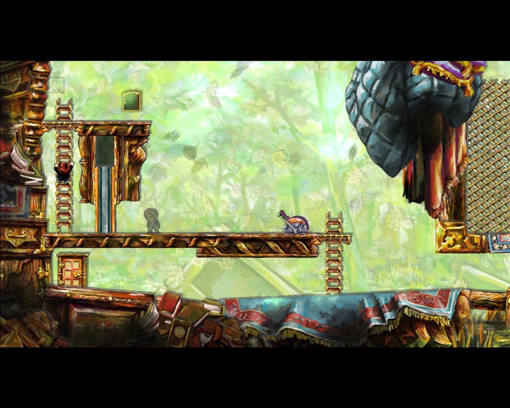 Braid stands out with its hand-painted, watercolor-inspired visuals. Unlike many puzzle-platformers that opt for pixel art or rigid sprites, Braid’s backgrounds feel like living canvases, with soft edges, stunning color gradients, and intricate details that reflect Tim’s emotional journey. The aesthetic creates an almost storybook quality, drawing you into what initially seems like a fairy-tale world.