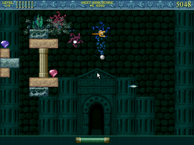 Bricks of Atlantis builds on the classic Arkanoid formula established by its predecessors, Bricks of Egypt and Bricks of Camelot, but brings the action underwater. The core objective remains the same: use a paddle to bounce a ball and clear every brick on the screen. What sets this entry apart is the depth of its item system. Alongside familiar power-ups like the expanded paddle, shrunken paddle, slow ball, fast ball, sticky paddle, multi-ball, poison, and extra life, you’ll also encounter a host of helpful fish that swim onto the playfield to assist you.