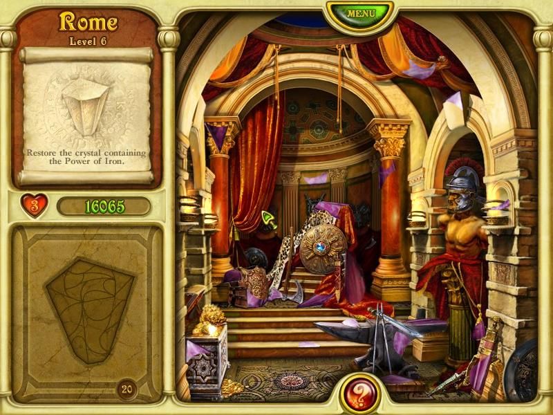 Between these fast-paced matching stages lie ornate hidden-object scenes. Here, artifacts shatter into multiple fragments scattered across rich illustrations of mythic temples or bustling markets. Locating each shard unlocks the next phase: assembling the broken crystal, only to see it splinter once more and challenge you to find every final piece. This back-and-forth rhythm—swap, gather, assemble, repeat—keeps the gameplay fresh and steadily raises the stakes as you voyage from Greece to Troy, Phoenicia, Babylon, Egypt and Carthage in your quest to restore Atlantis.