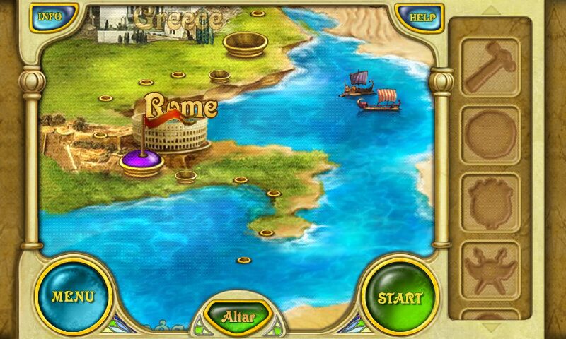 Once a seal is broken, you’re transported to the first land—Rome—where match-three grids demand swift swaps to line up rows of three or more identical symbols. Timing is critical: each board is timed, and power-ups like the Bomb of the Titans or Lightning of Zeus can only tip the scales if you build enough combos. Larger matches charge special bombs, while four- or five-in-a-row grants you destructive abilities that clear clusters of gems, helping you funnel key puzzle pieces to the bottom of the board.