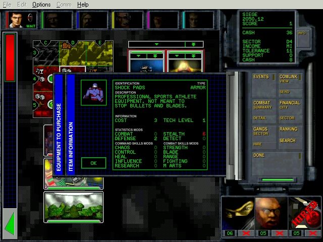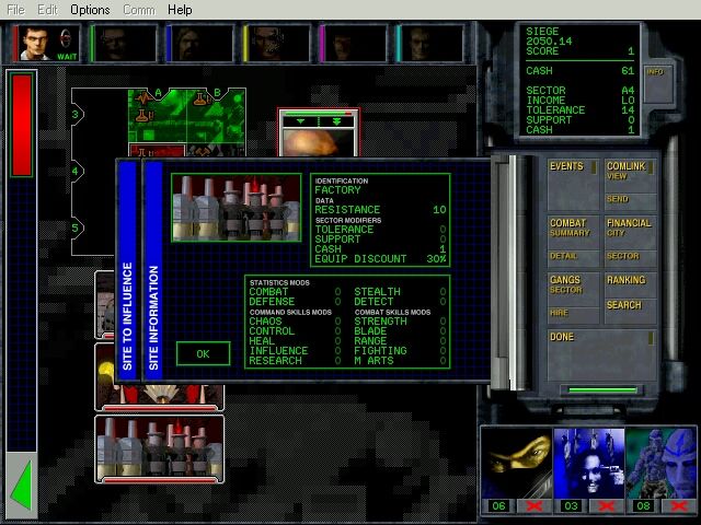 Combat in Chaos Overlords is automated and simultaneous turn–based rather than a granular tactical simulation. You set the stage by positioning your gangs and equipping them, and then let the game resolve the outcome—often with satisfying results as you’ve optimised gear and numbers. Multiplayer options are robust for its era, supporting hotseat, modem, LAN, or Internet (TCP/IP). Thanks to modest system demands at release, even internet matches tend to run smoothly.