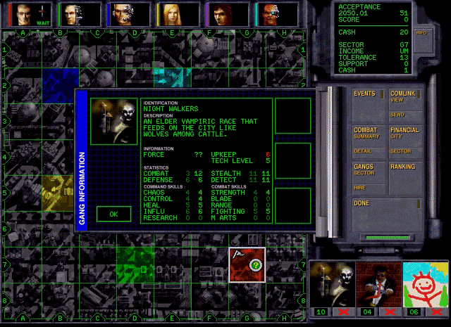 While not a visual powerhouse by modern standards, Chaos Overlords uses clear, functional graphics that serve strategic clarity over spectacle. The city grid is rendered in a simple isometric view, with each building type represented by distinctive icons and colour schemes to help identify your targets at a glance. This straightforward presentation ensures you’re never in doubt about which location yields prestige, healing, or research bonuses.