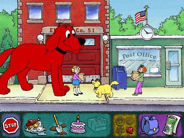The core of Clifford the Big Red Dog: Thinking Adventures unfolds as a friendly point-and-click adventure tailored for young players. After signing in and selecting four colorful jewels for Clifford’s collar, you’re guided to Emily Elizabeth’s room, where the story kicks off: it’s almost Clifford’s birthday, and several fun tasks await completion before the party begins. Navigating through town is intuitive—click on paths in the main view or use the rolled-up map in the bottom right, and keep track of your progress via Emily’s backpack inventory and the task list at the bottom of the screen.