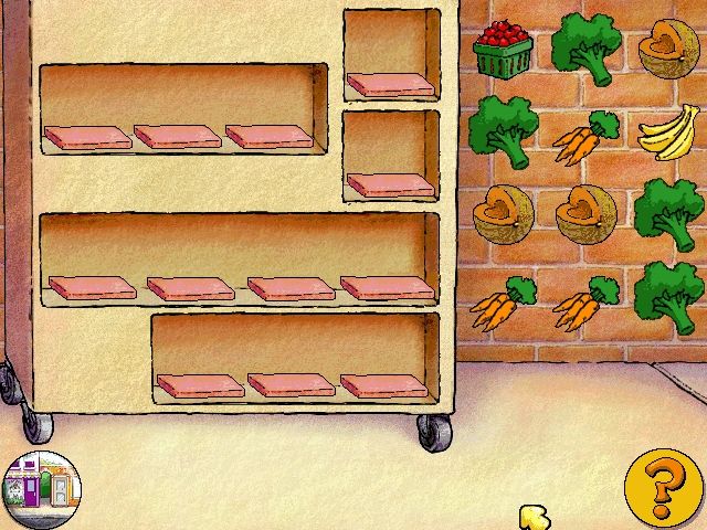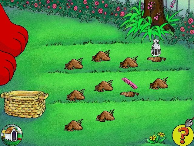 The interface supports young learners with clear visual cues and helper icons. A question-mark button on activity screens offers context-sensitive hints, and parents can consult the in-game manual’s “Hints for Parents” section for detailed item locations. The yellow arrow cursor keeps interactions simple, and the stop-sign icon in the corner provides an easy exit for both children and supervising adults. Overall, the gameplay loop combines exploration and problem-solving in bite-sized challenges that keep young minds engaged without overwhelming them.