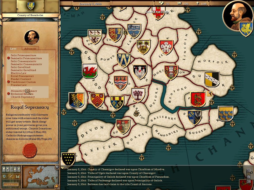 Unit sprites appear only when armies engage, showing stylized medieval banners rather than individual soldiers. While this abstraction may underwhelm those seeking battle-level detail, it keeps the focus on strategy. Menus and tooltips carry a parchment-inspired aesthetic, though modern players may find the interface feels dated compared to contemporary grand strategy titles.