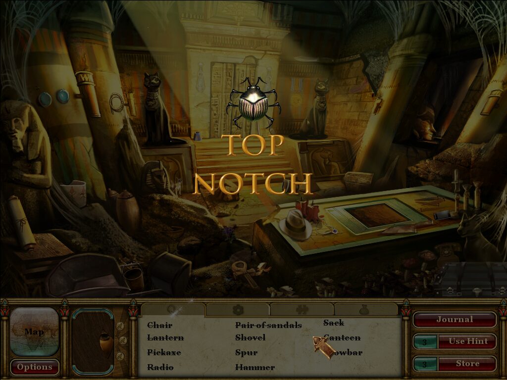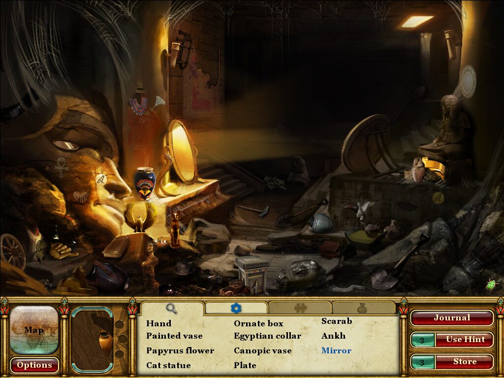 Curse of the Pharaoh: Tears of Sekhmet delivers a classic hidden-object experience woven together with light adventure mechanics. Players spend most of their time scouring richly detailed scenes for a list of items displayed at the bottom of the screen. The core gameplay loop involves clicking on each listed object, with items marked in red or blue automatically moving into specialized inventories for later use. This blend of search-and-find and inventory puzzles keeps the pace steady and engaging for both casual players and fans of the genre.