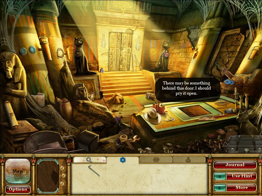Beyond searching, the blue gears tab allows you to drag tools—collected or purchased—onto the scene to trigger events or clear obstacles. Meanwhile, jigsaw-puzzle pieces and shop items stored under the brown sack tab open up mini-puzzles or grant special boosts. This layering of mechanics elevates the gameplay, ensuring that it never gets stale and that players gradually learn to juggle multiple systems as they progress through the tomb complex.