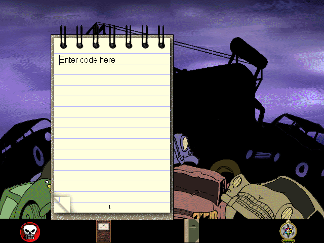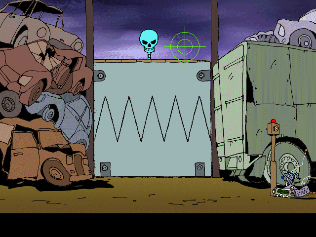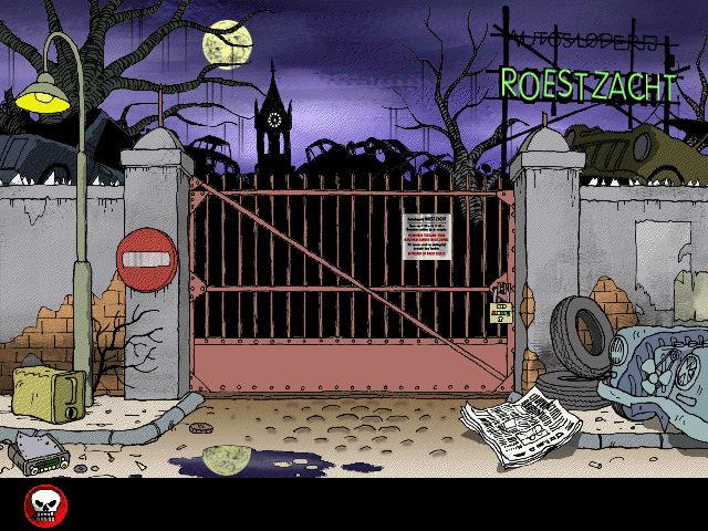 Graphically, De griezelbus 2 bears the hallmarks of mid-90s CD-ROM titles, featuring pre-rendered backgrounds combined with rudimentary 3D elements. The junkyard environments are artfully designed, showcasing broken vehicles, rusty machinery, and winding paths that feel suitably ominous. Colors lean toward muted browns and grays, accented with the occasional flicker of neon paint, creating a gloomy yet intriguing atmosphere that recalls the original book illustrations.