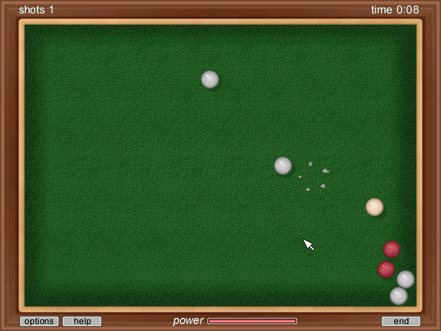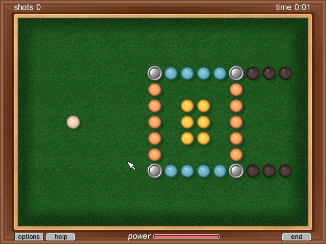 Controls are intuitive: you aim with a directional cursor and adjust shot power with a simple pull-back motion on gamepad or mouse. The first shot of every turn must use one of the white cue-balls, but after that, you’re free to fire from any stationary, non-grey ball. This rule encourages creative thinking, as you might intentionally leave a colored ball in place to line up a more advantageous multi-ball volley on your next move.
