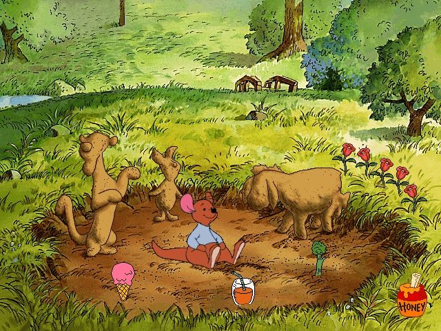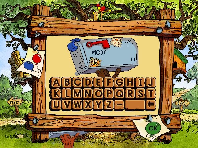 Disney’s Ready to Read with Pooh greets players in the familiar Hundred-Acre Wood, where Winnie the Pooh drifts down by balloon to set up the charming Treehouse home screen. Gopher delivers a personalized mailbox, and Pooh’s honey pot transforms into the options menu. This whimsical setup immediately draws young readers into an interactive world, using simple point-and-click controls. The cursor, styled as a busy bee, flutters when it’s over a clickable spot and carries an arrow to guide players along paths to new areas.