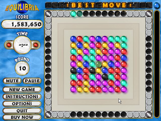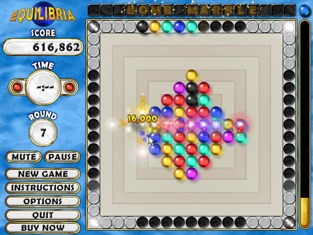 Equilibria delivers a deceptively simple yet deeply engaging core mechanic: remove groups of at least three adjacent marbles of the same color by clicking on them. As you clear clusters, fresh marbles are thrown into the playfield from four sides, each batch containing between three and fifteen spheres that immediately gravitate toward the center. This push-and-pull dynamic creates cascading reactions, often leading to satisfying chain clears and dramatic shifts in the board’s balance.