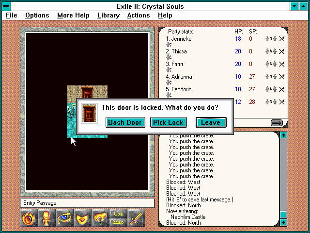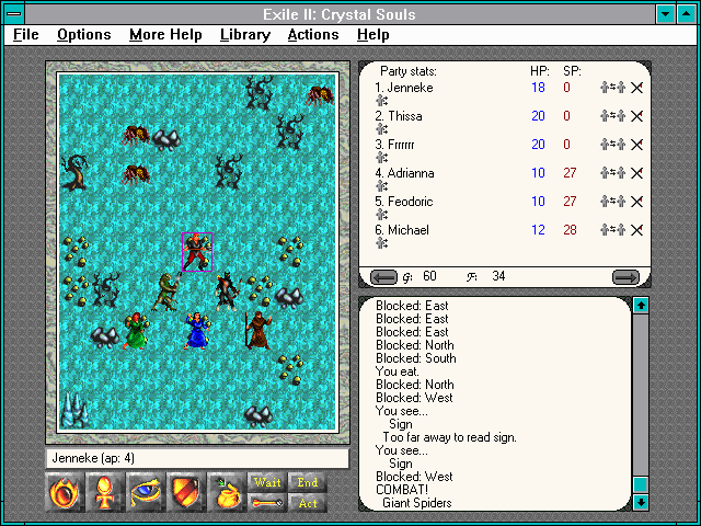 Exile II employs a clean, tile-based 2D graphical style that faithfully captures the spirit of early ’90s computer RPGs. While not pushing modern hardware, the game uses a rich color palette to distinguish between cavern walls, water features, and different types of terrain. Character and monster sprites are small but well-defined, allowing you to recognize foes at a glance.