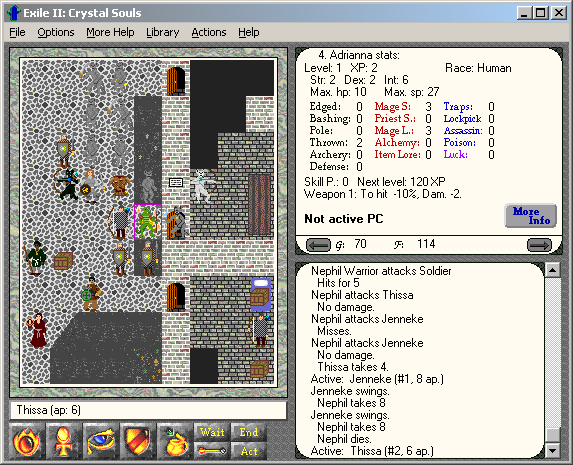 Exile II: Crystal Souls delivers a classic, top-down RPG experience that will feel immediately familiar to fans of the original Exile. You assemble a party of skill-based characters, choosing from traditional classes—warriors, rogues, mages, and clerics—as well as tamed creatures like the rodent-like Nephil or the reptilian Slith. Each character advances through a robust level-up system, earning attribute points to distribute among strength, dexterity, intelligence, and more, giving you fine-grained control over your party’s build.