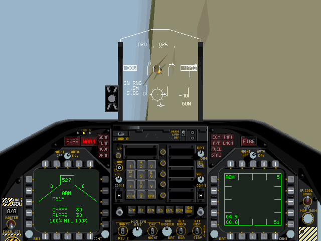The GUI overlays, including radar scopes, weapon status readouts, and mission timers, maintain the minimalist aesthetic. Information is presented in crisp vector text and symbols, ensuring readability even when maneuvering at high g-forces. Overall, while the graphics may feel dated compared to modern flight sims, Hornet’s art direction was state-of-the-art for its era and remains an effective balance of performance and functionality.