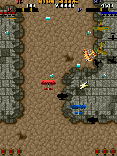 The game’s core loop centers on careful resource management and aggressive offense. Between stages, your plane lands on a runway for refueling and maintenance, adding a brief but strategic pause to plan which power-ups to retain. Bonus points are awarded for unused bombs and collected lightning bolt icons, incentivizing precise bomb usage and aggressive item collection. This blend of survival and scoring mechanics encourages replayability as players strive to maximize their bonuses on each run.