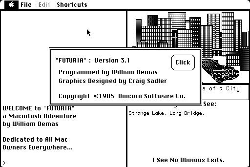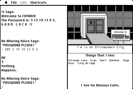 Futuria stands out as a testament to the ingenuity of early Macintosh game development. Its seamless integration of machine-language performance with the Mac’s user interface makes for a smooth, responsive adventure. Loading screens are quick, and save/load functions feel instant, enabling you to experiment with different command approaches without tedium.