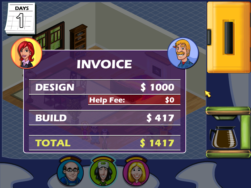 A distinctive element of the game is its two-phase approach: planning and building. After you’ve filled the room blueprint with objects, the build button starts flashing once you reach the required satisfaction threshold. Clicking it transitions you into the construction phase, where you assign workers to bring your designs to life. You click on a worker’s portrait, select a blueprint feature, and watch the item gradually fill from blueprint grey into full color. This mechanic adds an engaging layer of resource and time management; you must monitor each worker’s stamina bar and drag a jar of coffee onto them whenever they run low, lest construction grind to a halt.