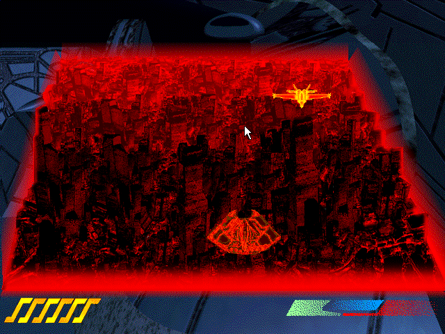 For a mid-90s mission disk title, Alien Weapons Expert delivers surprisingly crisp visuals. The game uses 2D sprites for your alien fighter and the enemy jets, but these sprites are detailed enough to distinguish different aircraft types at a glance. Explosions are rendered with colorful fireballs and debris particles that scatter realistically across the screen, adding to the spectacle of your city-leveling rampage.