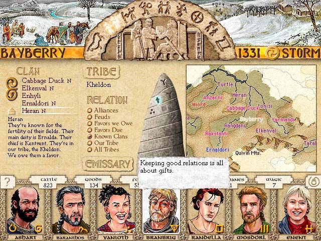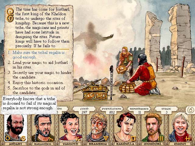 The user interface pairs these illustrations with clear, intuitive menus and icons. Seasons, resources, and clan statistics are always accessible through a straightforward panel layout. While the design may seem austere compared to modern strategy games, its simplicity ensures that players remain focused on the narrative and strategic choices rather than flashy animations.