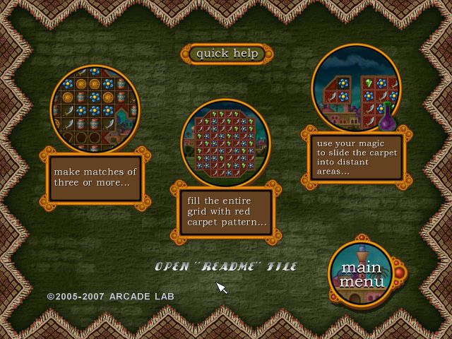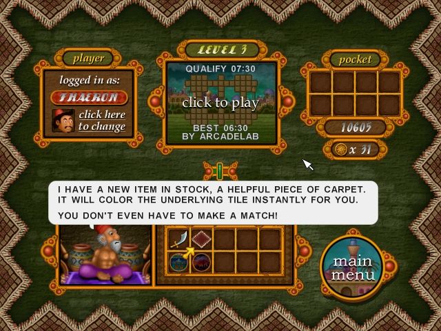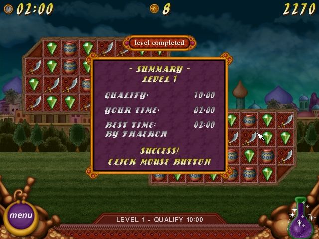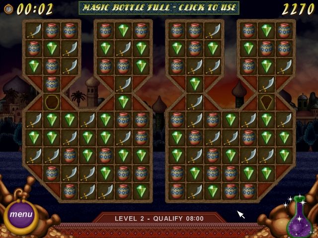 Legend of Aladdin offers a classic match-3 puzzle experience with an Arabian twist. Players swap neighboring bricks—either horizontally or vertically—to create lines of three or more identical tiles. When a match is made, the matched tiles disappear, the bricks above fall downward, and new tiles cascade in from the top. Each time the background grid is completely cleared of tiles, a patch of magic carpet appears, and filling the entire board with carpet completes the level.