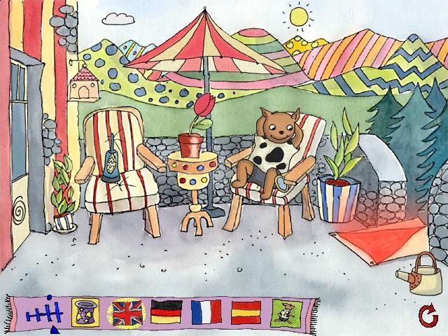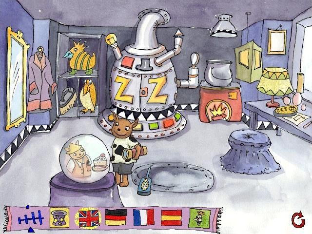Max and the Magician unfolds as a classic point-and-click adventure that invites players to explore a whimsically illustrated castle in pursuit of magical spell fragments. Using a simple mouse-driven interface, younger gamers can intuitively navigate through rooms, interact with animated objects, and gather clues without ever feeling overwhelmed. The game begins with a charming setup screen that lets you choose your language—English, German, French or Spanish—and a magic hat icon that doubles as a save slot. This approach to saving is both novel and practical, encouraging kids to return exactly where they left off simply by clicking on their chosen hat.