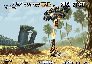 Metal Slug has always been renowned for its stunning sprite work and vibrant color palette, and the PlayStation port preserves these assets with remarkable fidelity. Every frame is packed with detailed character designs, fluid animations, and expressive enemy models that convey weight and personality. From the wobbling treads of the titular tank to the exaggerated ragdoll physics of defeated foes, the visual flair is never lacking.