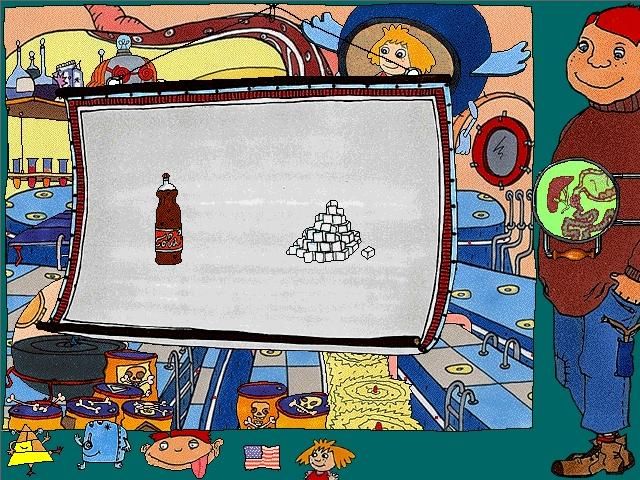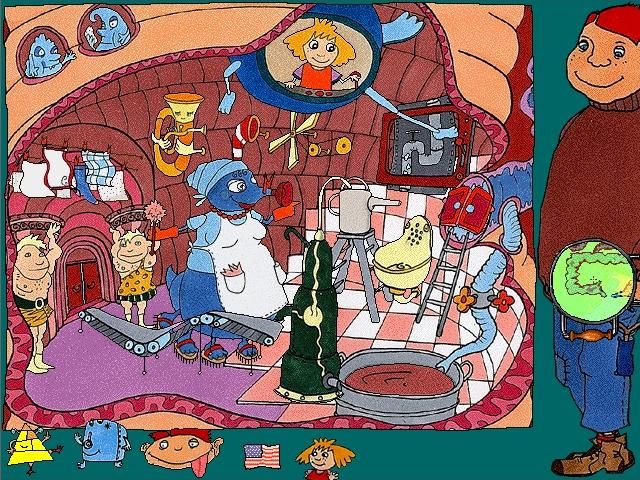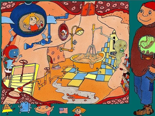 Millie Meter’s Nutrition Adventure greets players with a simple, mouse-controlled interface that keeps the focus on exploration and learning. You guide Little Millie into the mouth of Bulk the Giant by clicking on doors or moving the x-ray viewer along the side panel to navigate through each stage of the digestive tract. The layout is intuitive: the option icons along the bottom let you track your progress toward completing the Golden Pyramid, replay mini-games, adjust volume, change languages, or exit the game without ever losing your place in the adventure.