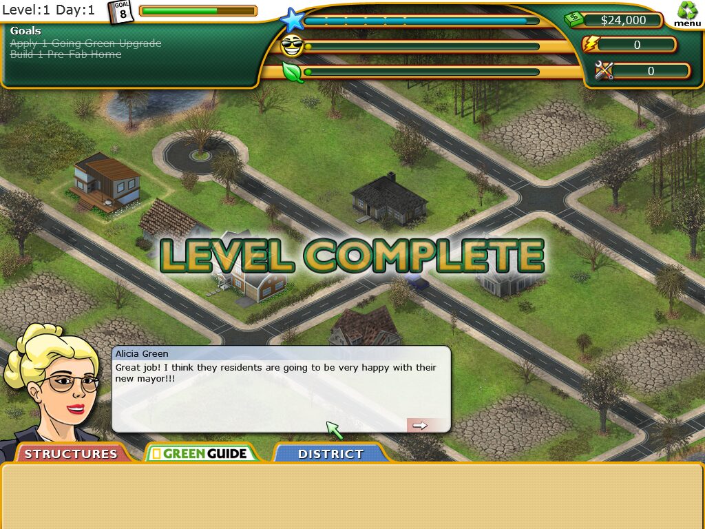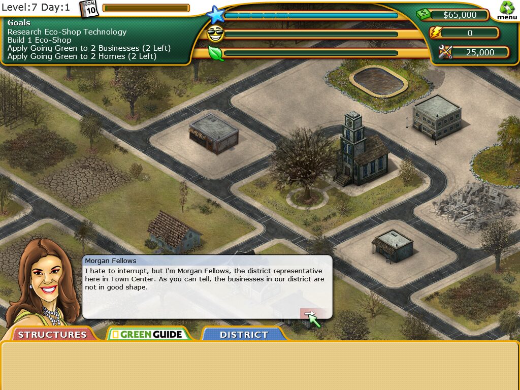 While Plan It Green is primarily a simulation and management game, it weaves in a light narrative framework to guide players through its educational content. You assume the role of a rookie mayor tasked by National Geographic to rescue a city teetering on the brink of environmental collapse. Each campaign level presents a short briefing that outlines challenges—skyrocketing energy usage, low citizen morale, or polluted waterways—and sets actionable goals you must fulfill.