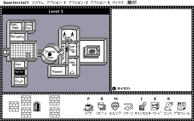 Visually, Quarterstaff is a testament to early color Macintosh capabilities. Infocom’s development team applied a fresh coat of paint to the black-and-white original, adding vivid hues to cavern walls, glowing runestones, and the various monsters lurking in the dungeon depths. Although the resolution is modest by today’s standards, the hand-drawn feel of each sprite and background asset lends the game a charming, almost storybook quality.