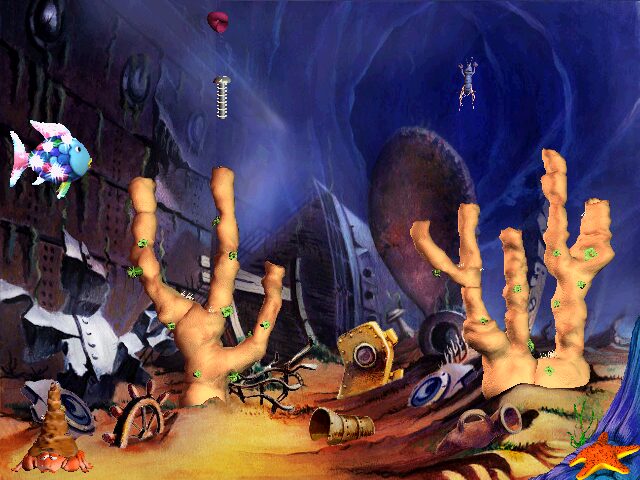 The visual style of Rainbow Fish and the Whale remains true to Marcus Pfister’s beloved picture books, featuring vibrant, watercolor-inspired backgrounds that pop on screen. Each environment—from the cluttered junkyard inside the whale to the tranquil sea gardens—boasts rich hues and subtle gradient shifts that bring the underwater world to life. Animations are smooth, with Rainbow Fish’s scales shimmering as he glides across the screen and bubble effects that add a playful sense of depth.