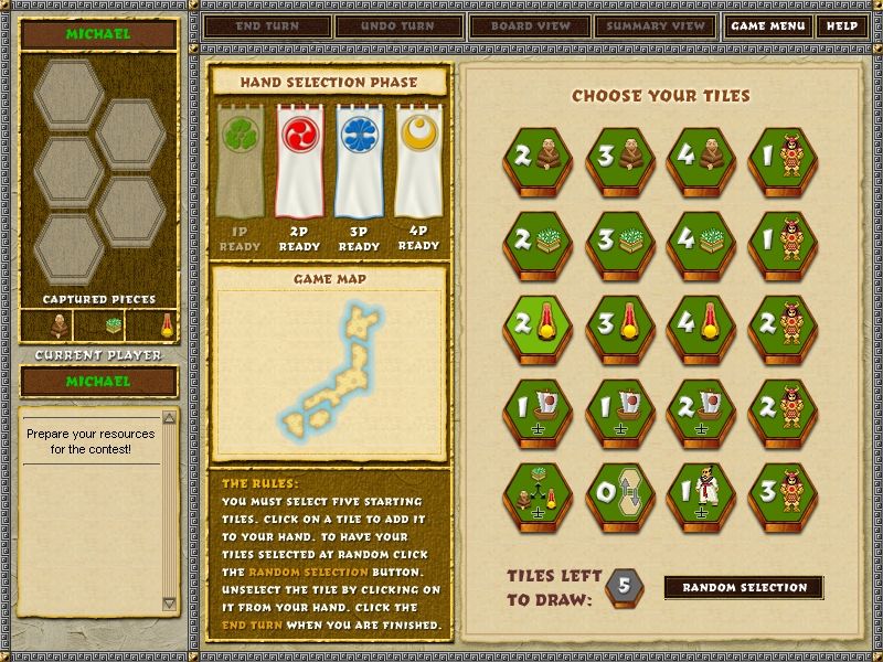 Reiner Knizia’s Samurai brings the acclaimed board game into a digital format with faithful adherence to its strategic core. The gameplay revolves around placing tiles on a hexagonal map of pre-unification Japan to sway cities toward your cause. Each turn, players choose from a deck of slow and fast tiles, with the slow tile count capped at one and unlimited fast tiles, creating a unique pacing that balances long-term planning and opportunistic placements.